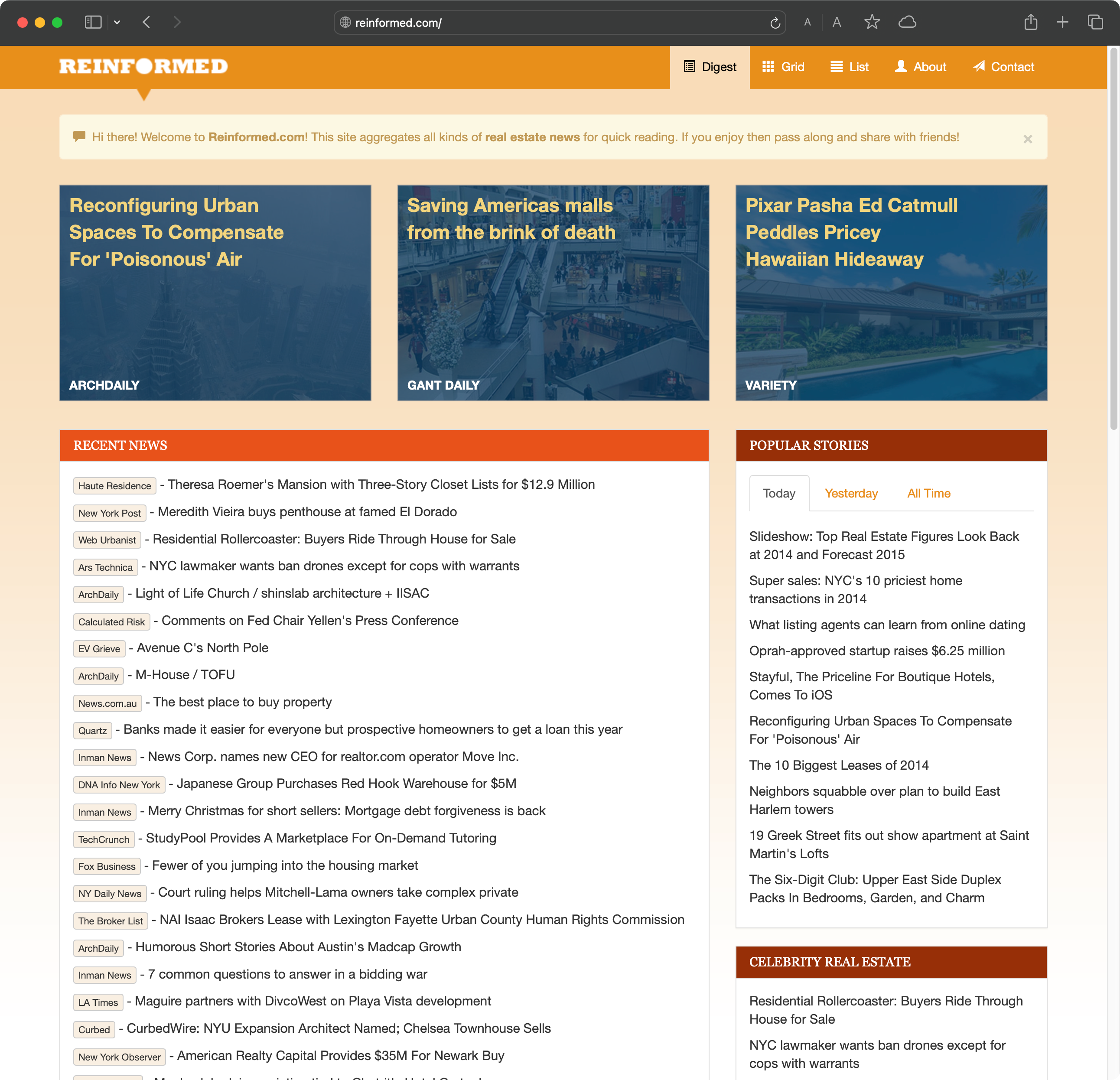 Reinformed.com was a curated real estate news aggregator built to simplify how industry professionals, investors, and enthusiasts consumed market updates. The site gathered content from top national publications, niche real estate blogs, and trusted local sources—particularly those focused on the Manhattan market.